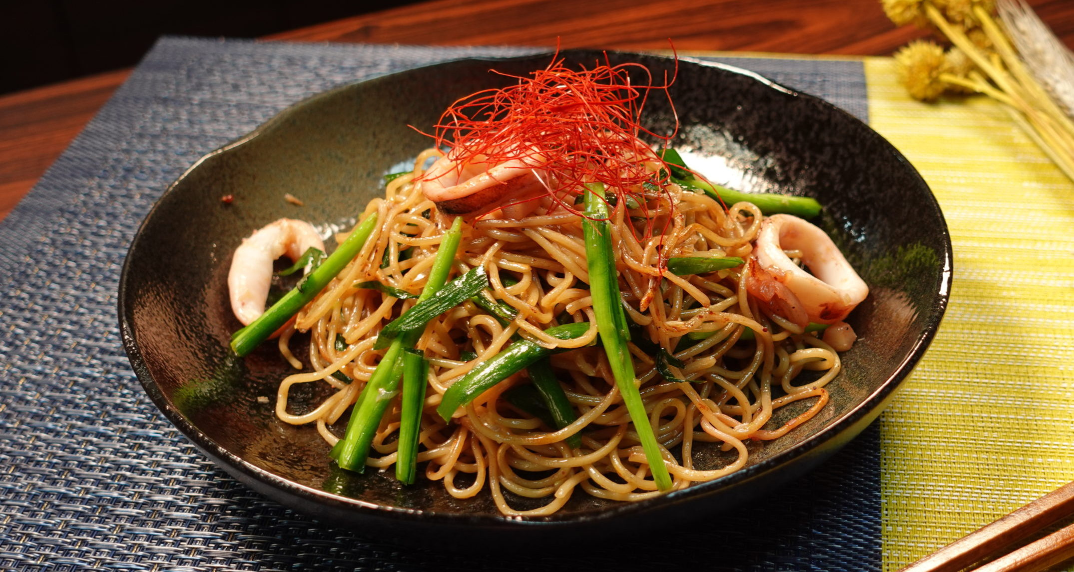 - 最後にラー油、糸唐辛子を加えたら『ガーリック焼そば』の完成です!